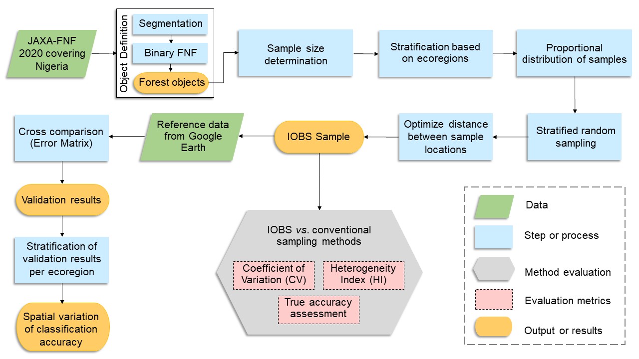 This project developed an integrated object-based sampling (IOBS) method that combines stratified random sampling, proportional allocation, and sample distance optimization to address these challenges. The IOBS method was applied to assess the accuracy of the Japan Aerospace Exploration Agency (JAXA) global 25 m PALSAR-2/PALSAR forest/non-forest (FNF) 2020 map across 14 ecoregions in Nigeria.